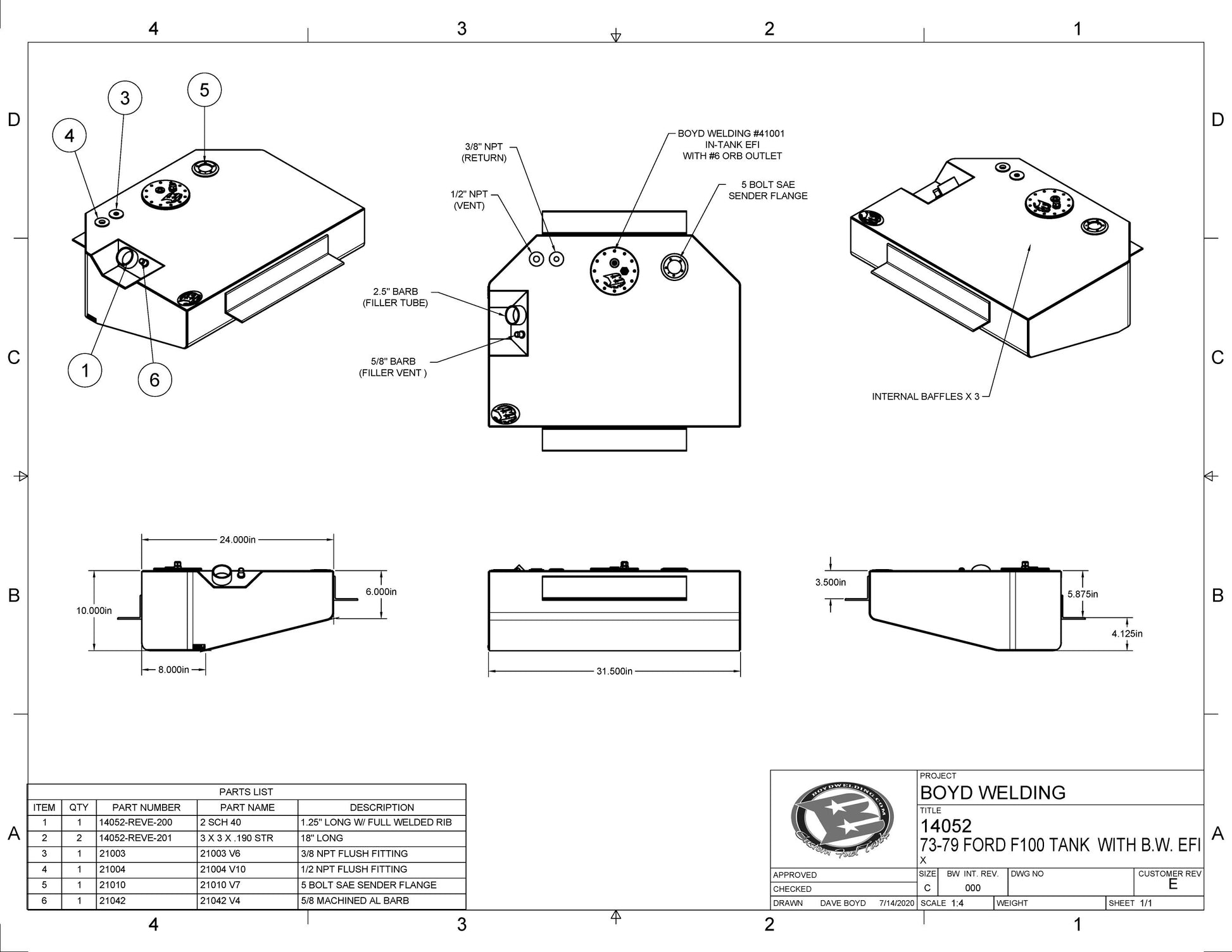 Tank Material: 1/8” 5052-H32 AluminumTank Dimensions: 31.5” x 24” x 10” Taper to 6”Approx Gallons: 23 approxFuel Fill: 2.25” Ribbed for HoseVent 1: 5/8” Ribbed for Hose Fill VentVent 2: ½” NPT Tank VentFuel Feed: Boyd 41001 In-Tank Aeromotive PumpReturn: 3/8” NPTSending unit Flange: YESBaffles: YES x3Mount Tabs: YES 3 x 3 x 3/16 Angle x2 places *This tank mounts in the F100 stock behind axle location using the stock fill location.* Pictures show optional accessories installed.Share this with your friends
