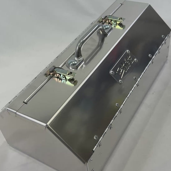 The Boyd 26 Series Flop Top Hand Carry Aluminum Tool Box measures 20.25" long, 10.25" wide, and 7.125" tall, with a total height of 9" including the handle. Constructed from .125" 5052 aluminum, it features aluminum hinges, plated steel latches, and aluminum pop rivets for durable assembly. The included and removable interior tray is a perfect place for small tools. Please note, the lid lacks a weather seal, so this box is not waterproof. It is ideally suited for securely transporting heavy tools, chains, or straps and is best stored inside a weather-tight container.