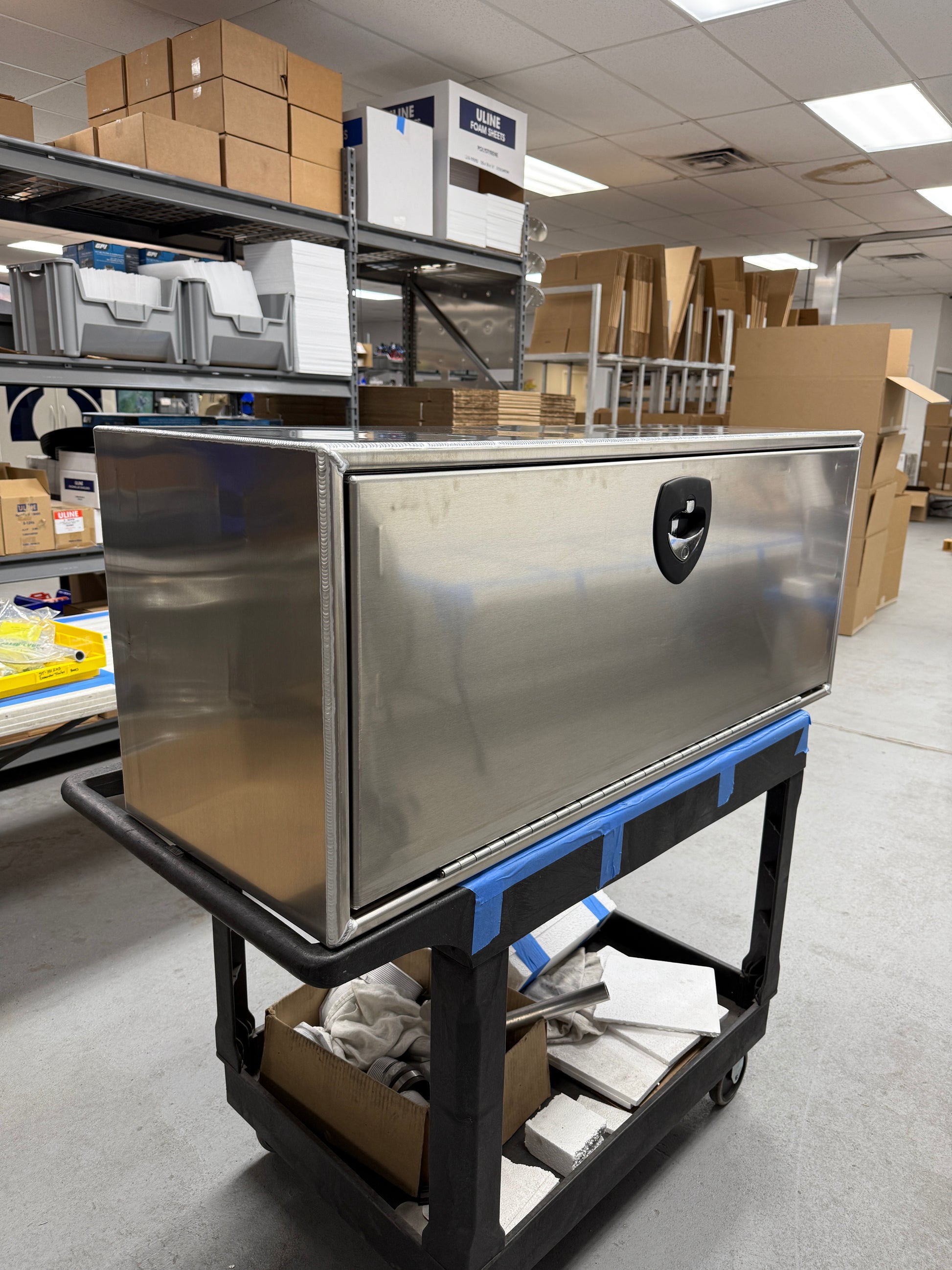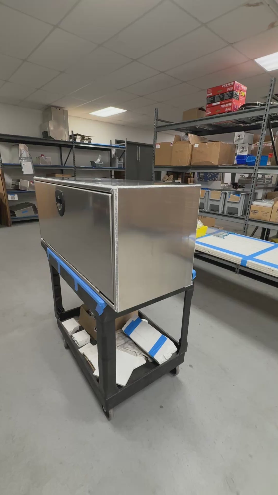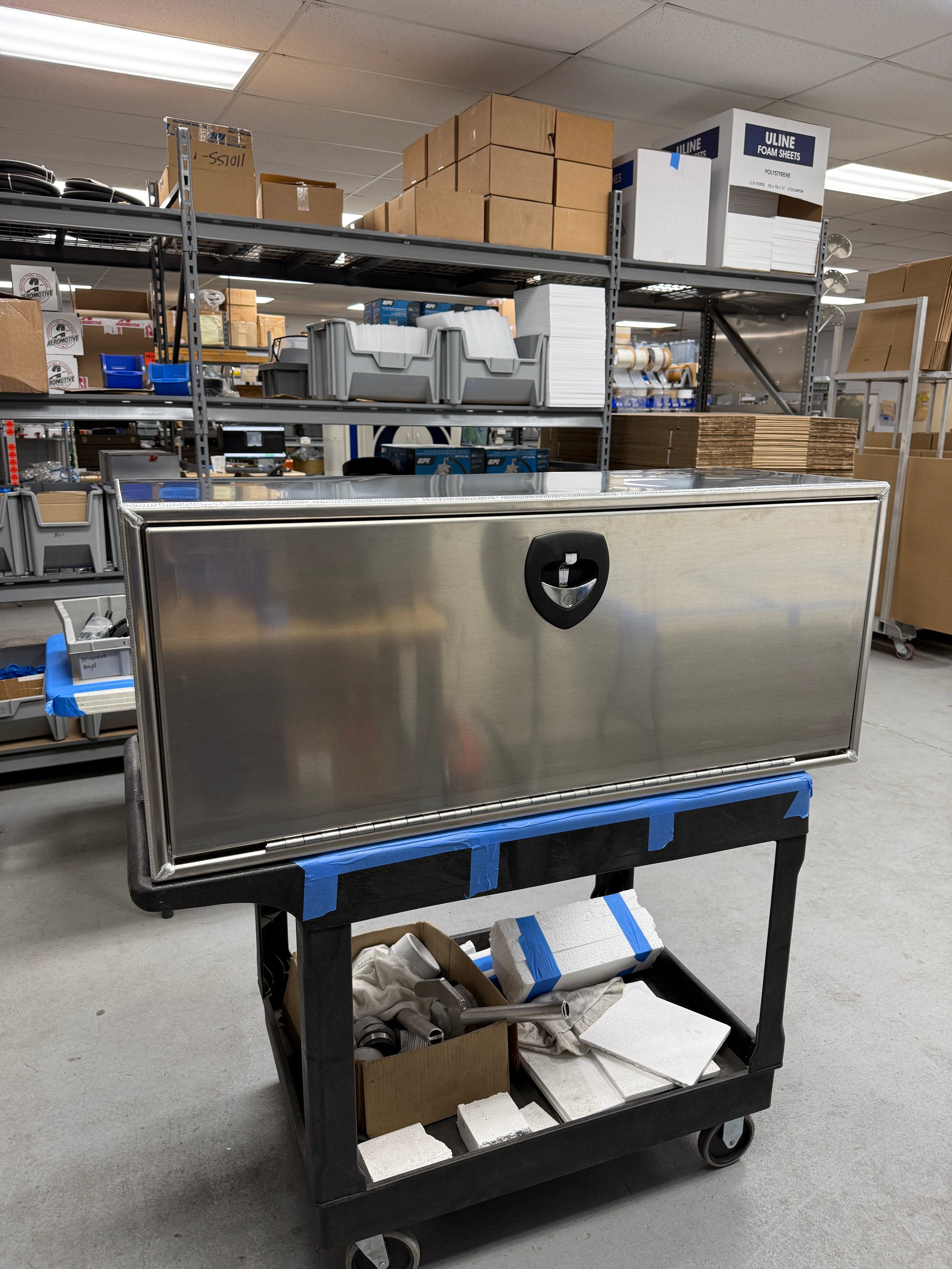 The Boyd 2918 Series 48 X 18 X 20 Aluminum Side Mount Truck Box is constructed from fully welded .125-inch 5052 aluminum, delivering exceptional strength and durability. It features an automotive-style bulb seal gasket recessed within a formed gutter-style door jamb, ensuring a secure, weather-resistant seal. The cabinet includes an adjustable shelf for flexible storage options. Additionally, Boyd tool box doors are fully reinforced, sit flush with the cabinet face, and provide a true 90-degree opening even when mounted adjacent to a wall or another box.
